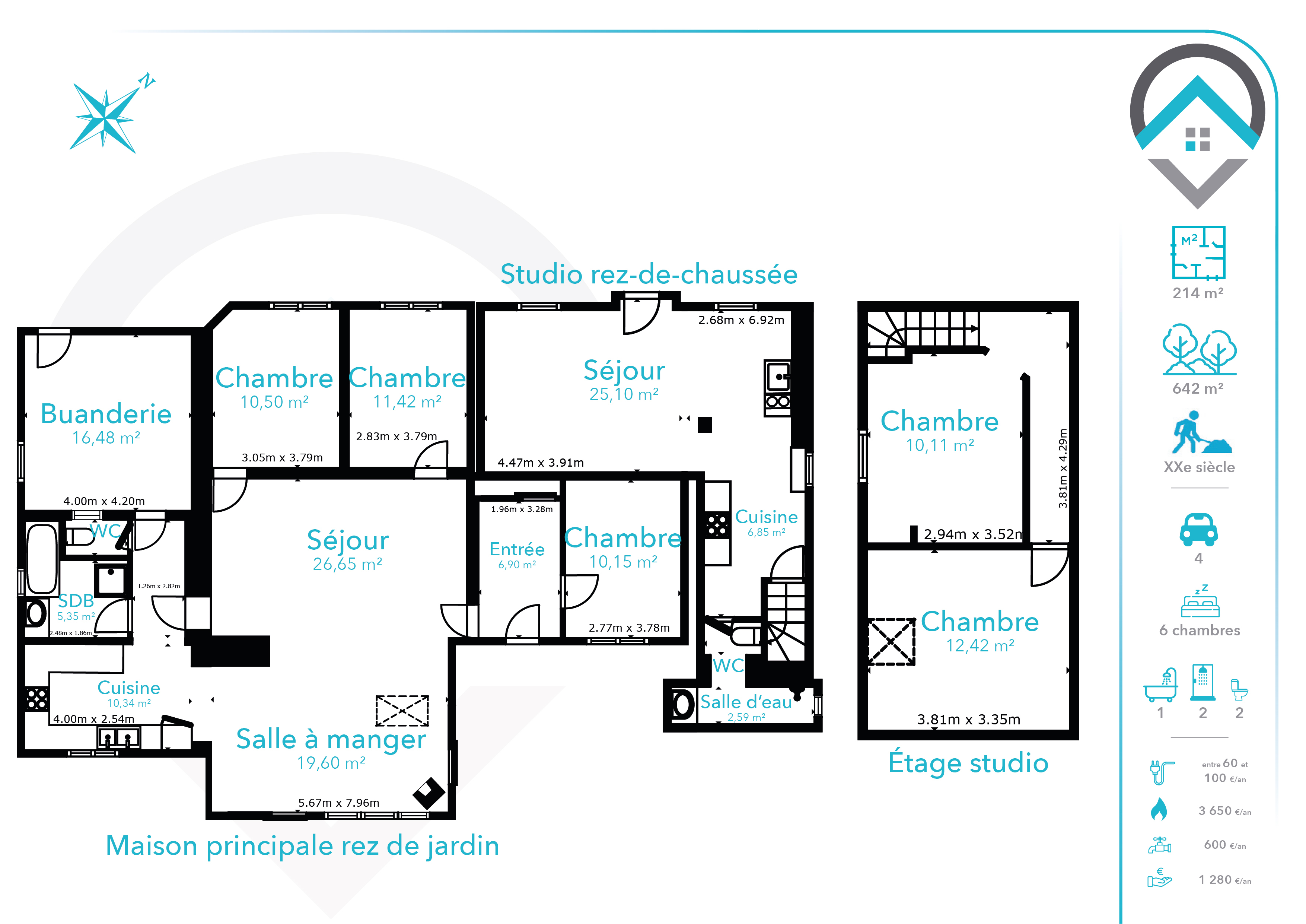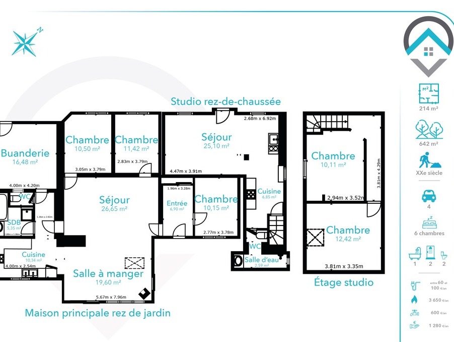 Elle se compose d'une maison principale de plain-pied d'environ 134 m², d'une dépendance attenante et d'un studio totalement indépendant de 62 m² avec sa propre entrée et son propre compteur d'eau.