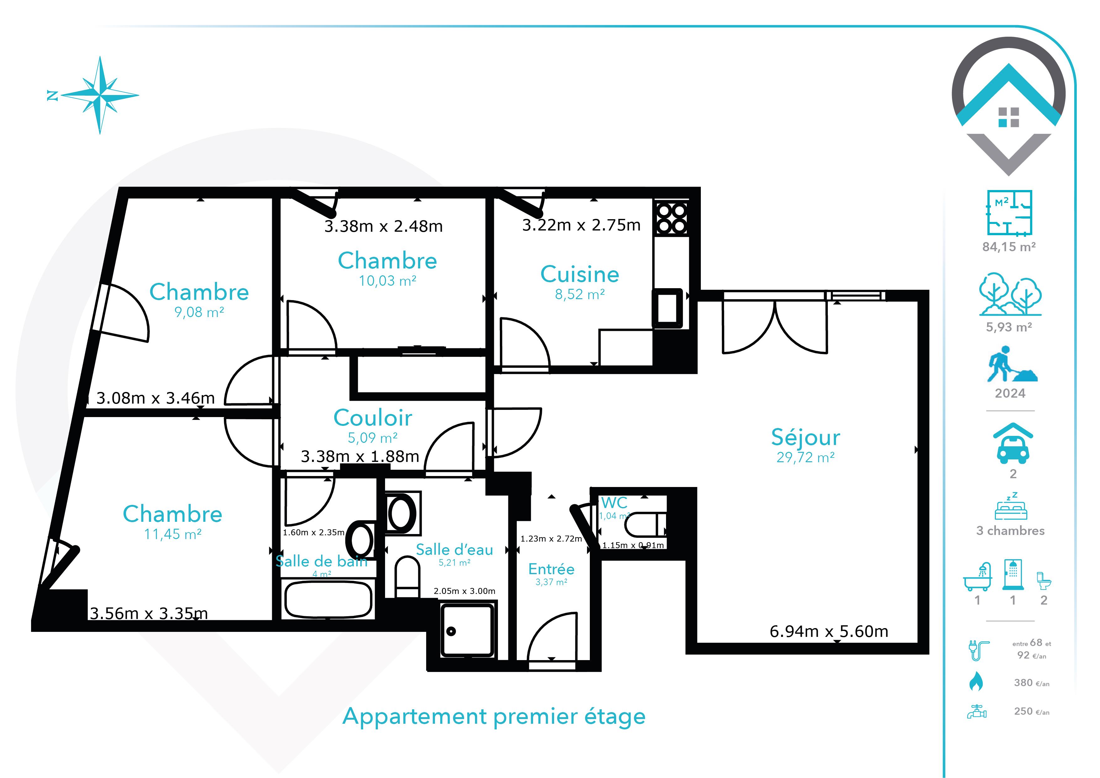 Répondant aux dernières normes énergétiques, ce logement bénéficie de prestations contemporaines garantissant confort et économies d'énergie. Deux places de stationnement en sous-sol, positionnées en enfilade (places commandées), sont incluses.