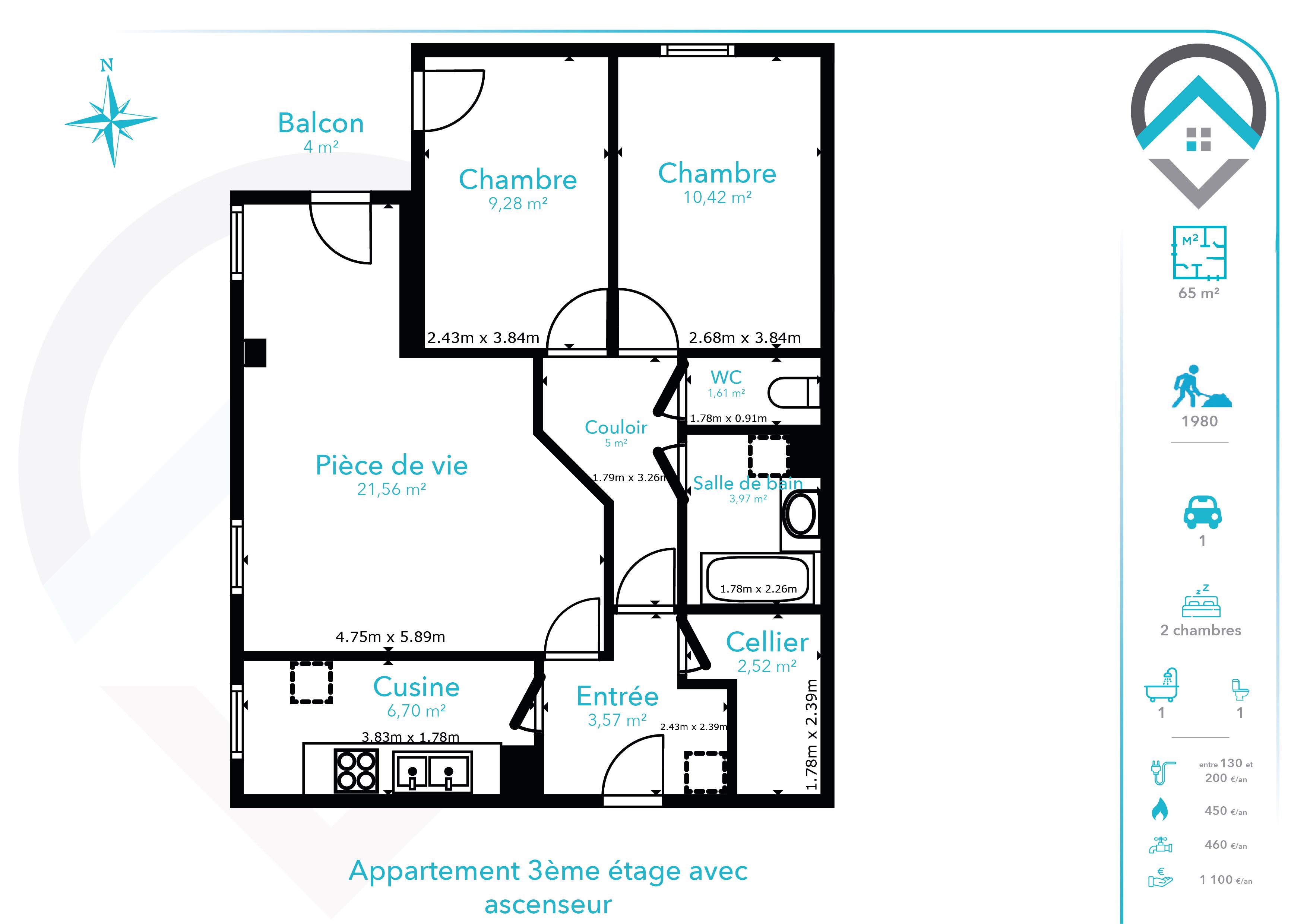 Au troisième étage d'une résidence privée, l'appartement se compose d'une entrée desservant une cuisine séparée, un séjour / salle à manger lumineux donnant sur un balcon, un cellier, une salle de bain, deux chambres dont une avec accès direct au balcon, ainsi qu'un WC séparé.