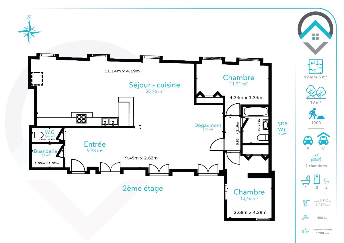 Au deuxième étage d'une petite copropriété, venez découvrir cet appartement de 3 pièces réparties sur 99 m².