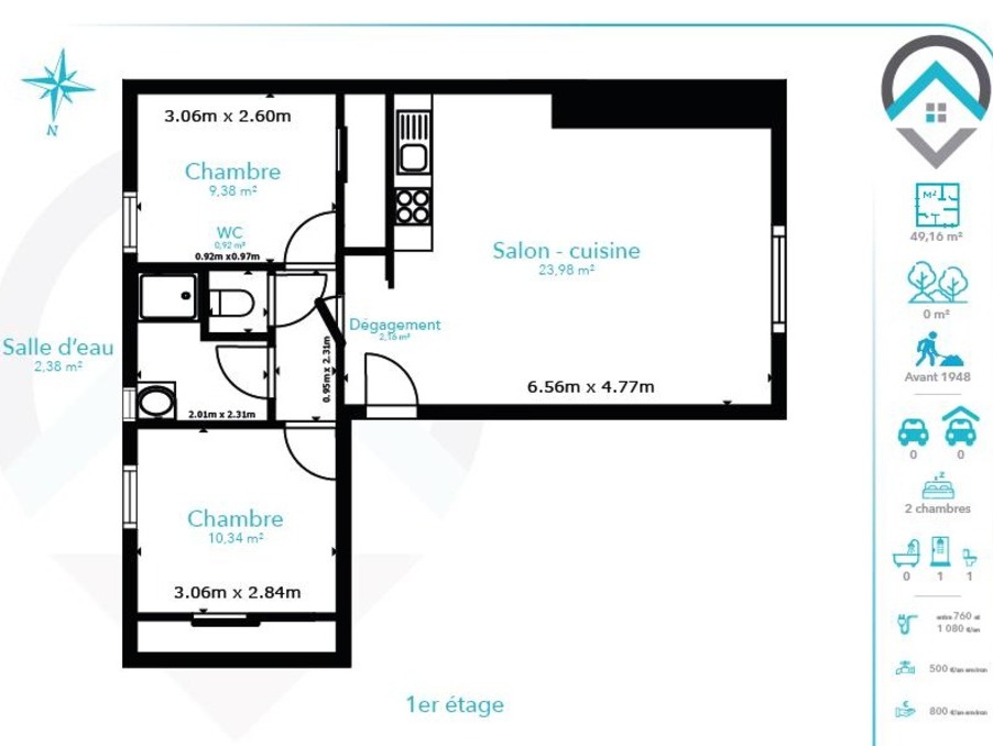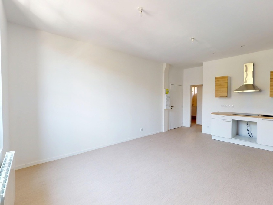 Nous retrouvons une entrée, un grand salon cuisine ouverte aménagée et équipée de 24 m² environ, deux chambres, une salle d'eau, et un W.C.