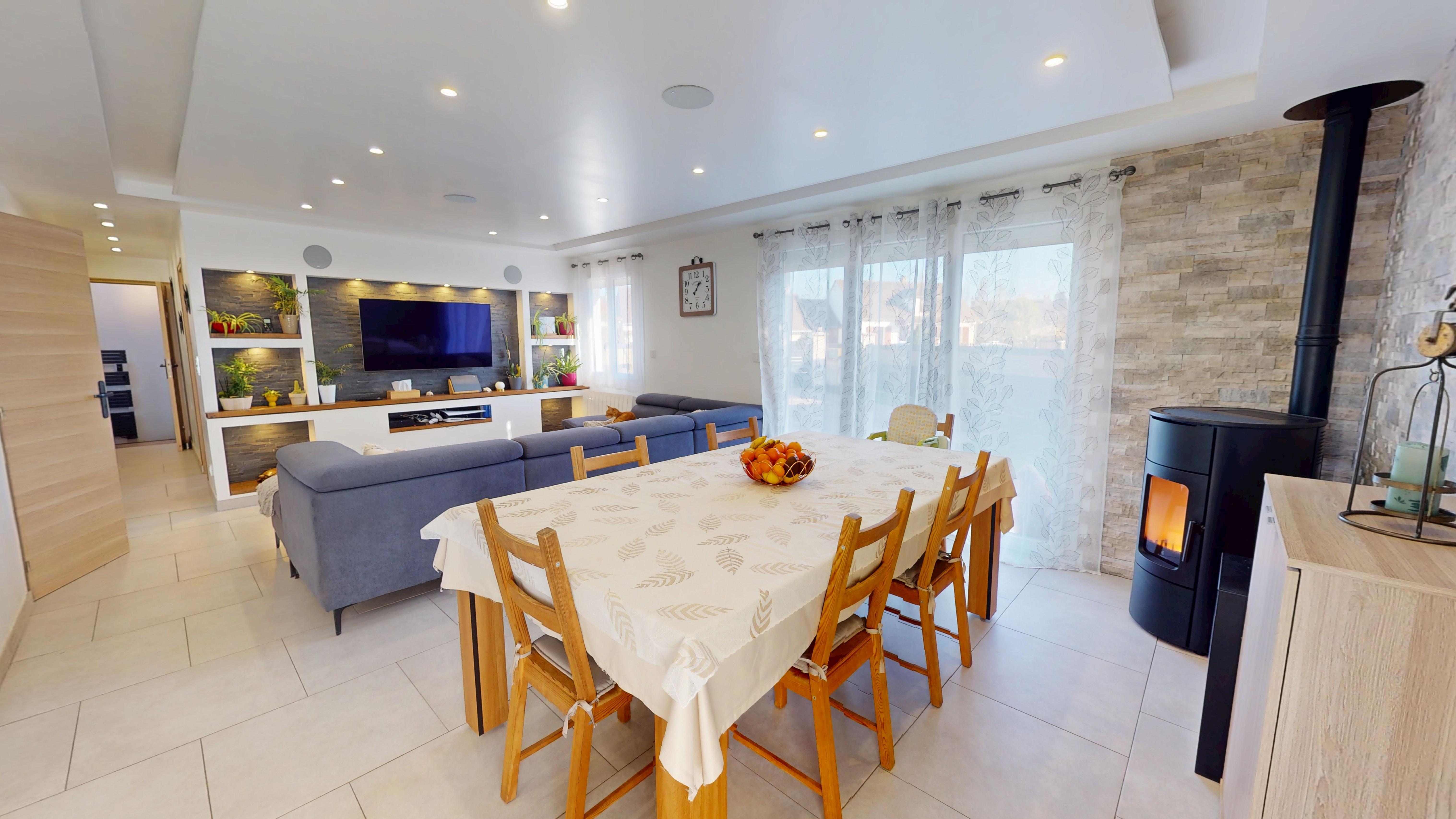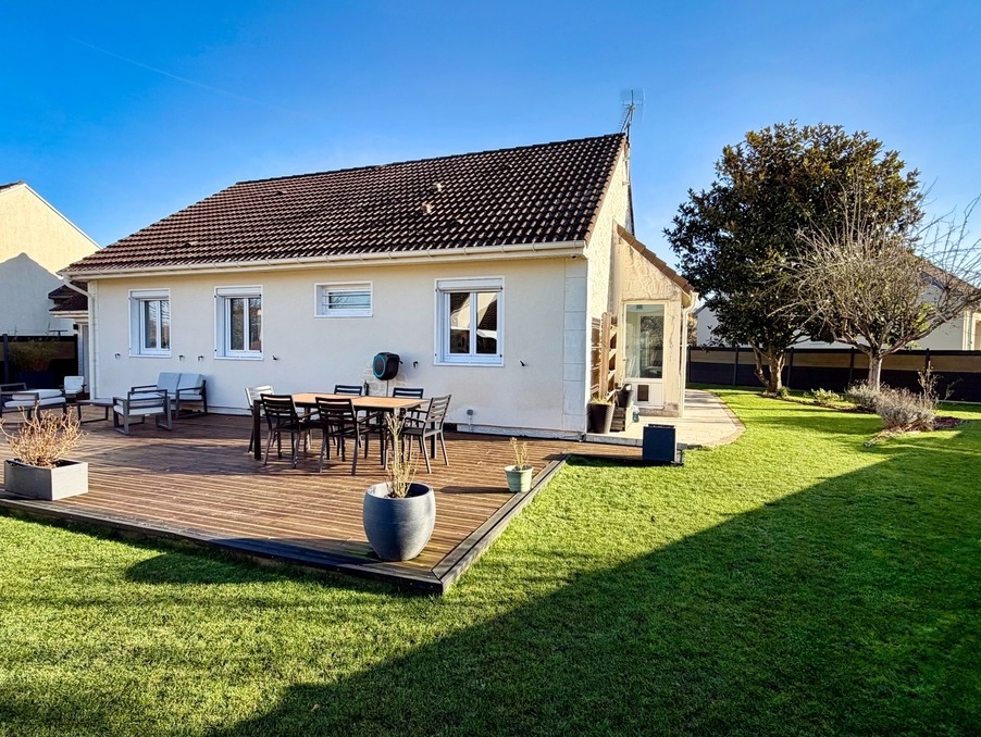 Édifiée sur un terrain clos de 604 m², elle s'ouvre sur une entrée accueillante sous une petite véranda, menant à une vaste et lumineuse pièce de vie exposée Est-Ouest. Celle-ci intègre une cuisine américaine aménagée et équipée, prolongée par un cellier pratique.