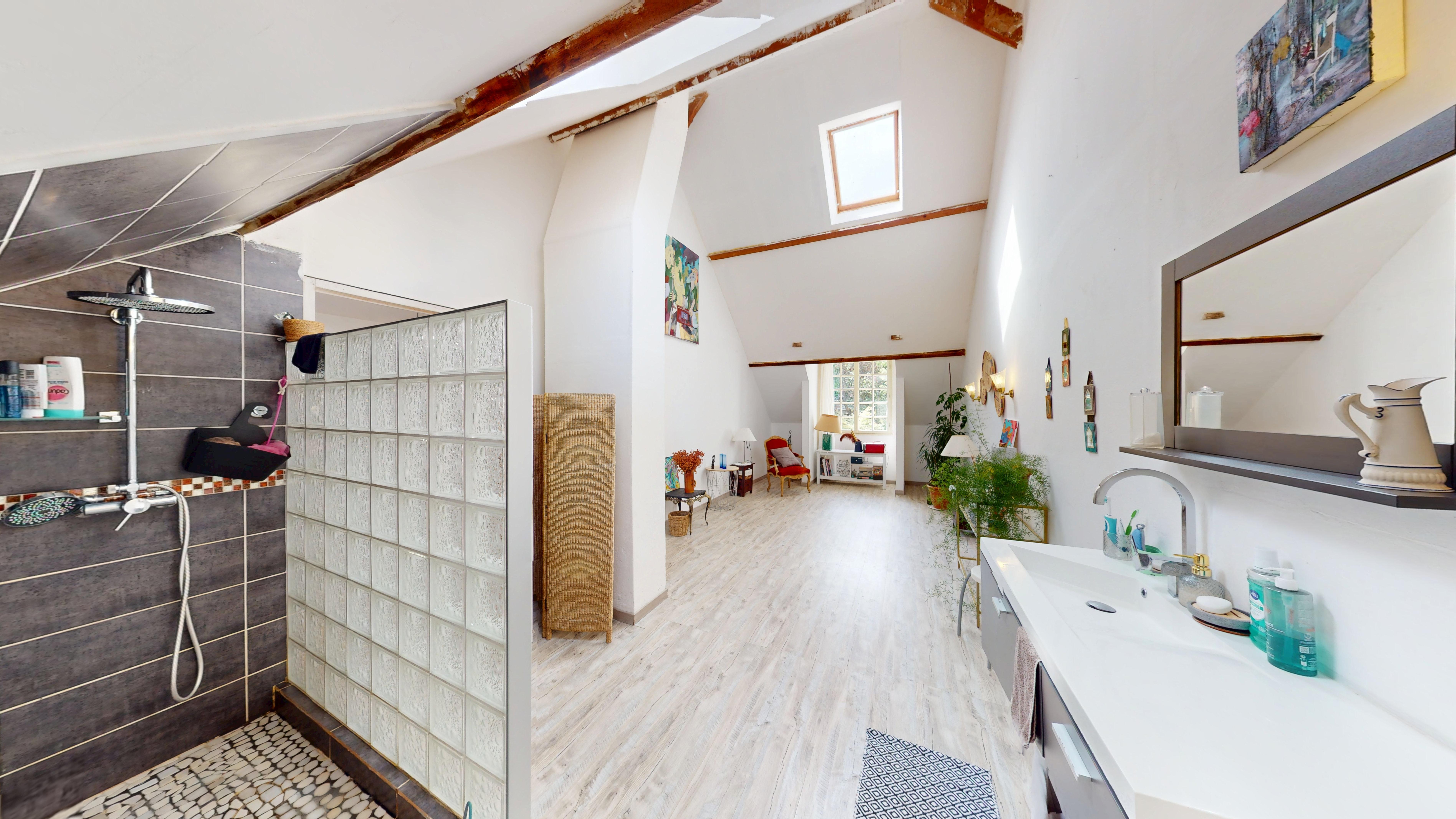À l'étage, un palier dessert trois belles chambres, dont une avec mezzanine, ainsi qu'une grande suite parentale d'environ 23 m² avec douche à l'italienne et WC.