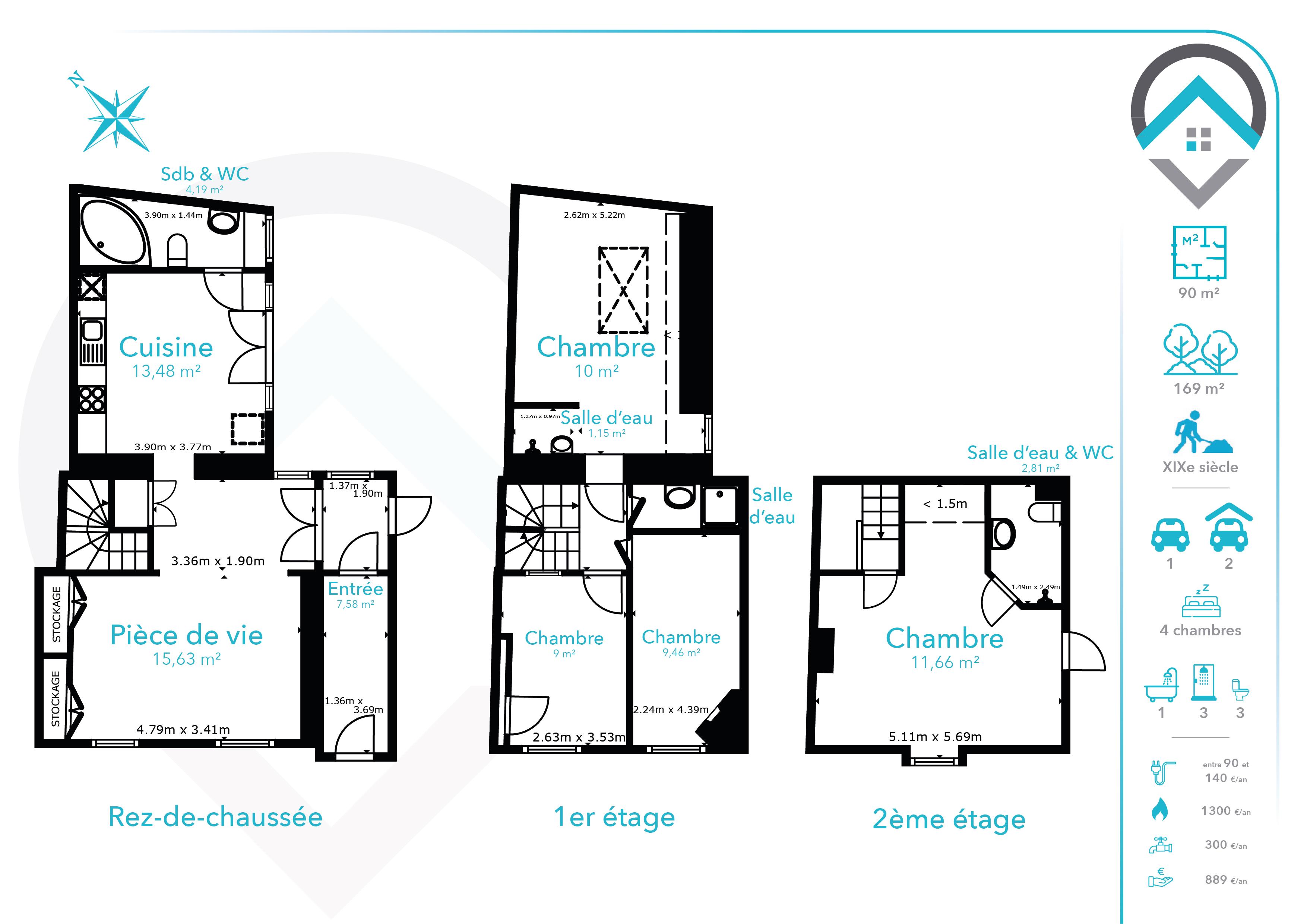 À l'étage, un palier dessert trois chambres, dont l'une avec sa propre salle d'eau, ainsi qu'une salle d'eau supplémentaire avec WC.