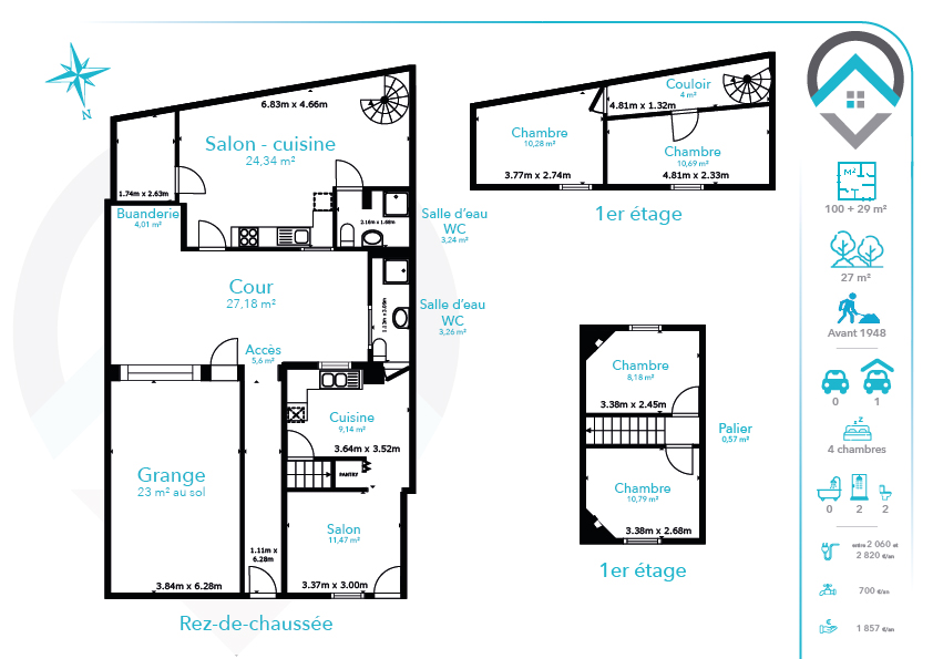 - Dans la seconde partie, un grand salon-séjour avec cuisine ouverte, une salle d'eau avec WC, une buanderie, un couloir et deux grandes chambres.