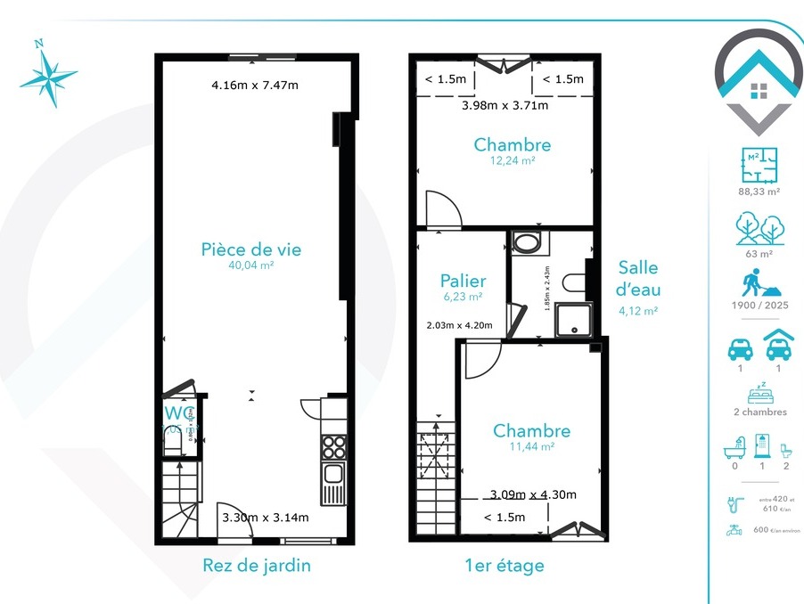 Dès l'entrée, vous serez séduit par une belle pièce de vie lumineuse de 40 m², comprenant une cuisine aménagée et entièrement équipée, parfaite pour recevoir et partager des moments conviviaux. Un WC indépendant complète le rez-de-jardin.